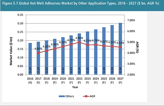 Hot Melt Adhesives Market Forecast 2017-2027:By Product Type (Polyurethane, EVA, Styrene Block Copolymers, Polyamide, Polyolefin, Others), by Application (Packaging, Non Rigid Binding, Construction, Automotive, Furniture, Others) & by Region Plus Profiles of Top Companies
