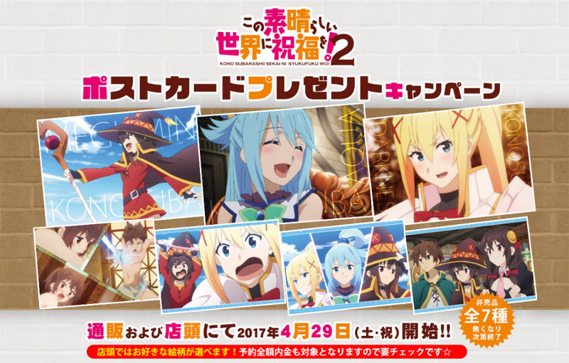 4/29(土)より、ジーストア各店、コスパオフィシャルショップほかにてTVアニメ『この素晴らしい世界に祝福を!2』【非売品ポストカード】が貰えるキャンペーンの開催が決定。