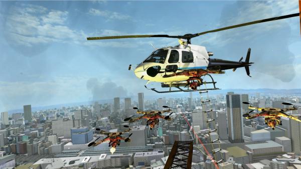 「SKYエスケープ~高所恐怖体験~」はエレベーターで超高層ビルの屋上に上がり、不安定な細い鉄骨の上を渡ってヘリコプターに乗り込んで脱出するというVR。