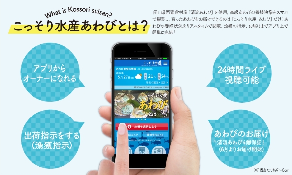 ■『こっそり水産 あわび』とは水産物など全国各地の特産品の区画オーナーになって、ライブカメラで24時間、リアルタイムで生育を観察できます。『こっそり水産 あわび』で育てるあわびは、国産「清流あわび」4個です。実際に育つあわびの姿をリアルタイムで観察・撮影でき、「清流あわび」が育つ2017年6月に、区画オーナーがご指定した場所へ、新鮮な状態でお届けする水産業IoTサービスです。『こっそり水産 あわび』は、2017年3月25日に区画オーナー募集開始したところ、わずか25日で定員となりました。地方創生サービスとして、多くの方にご利用いただくため、「清流あわび」を養殖する水槽の増設し、48名を追加で募集を開始しました。先着順のため定員が埋まり次第、追加募集を終了いたします。