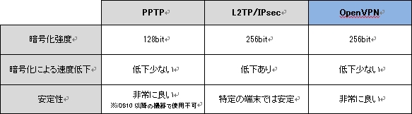 ■モバイル機器に最適。安全度も最高で通信速度も下がりにくいOpenVPN採用