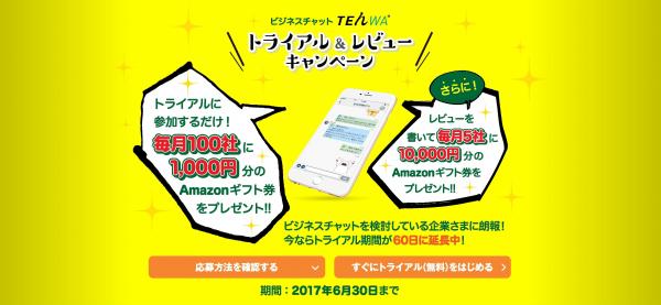 「TEんWA」では、本日から6月末まで、「トライアル&レビューキャンペーン」を開催させていただきます。 無料トライアルお申込みいただいた企業さまには毎月抽選で100社にAmazonギフト券1,000円分、トライアルに関するレビューを書き込んでいただいた企業さまに、毎月抽選で5社にAmazonギフト券10,000円分をプレゼントさせていただきます。