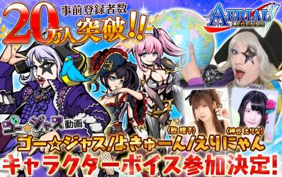 先日、ゲーム実況バラエティチャンネル「ゴー☆ジャス動画@Game Market」内の『エアリアルレジェンズ』先行プレイ動画にて、事前登録者数が20万人を突破した場合、「ゴー☆ジャス動画」出演キャストである、「ゴー☆ジャス」、「よきゅーん(乾 曜子)」、「えりにゃん(神谷えりな)」の3名が、『エアリアルレジェンズ』のゲームキャラクターボイスを担当することを発表いたしましたが、今回、事前登録者数が20万人を突破いたしましたので告知どおり、3名のゲームキャラクターボイス参加が確定いたしました!