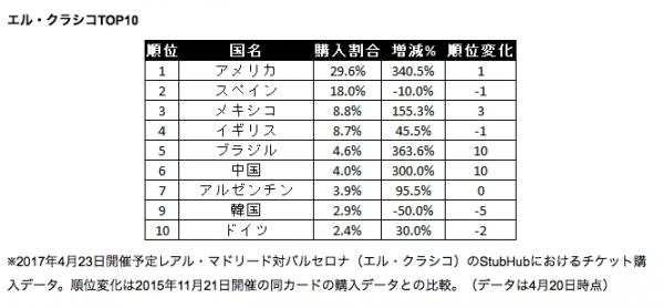 レアル・マドリードの本拠地サンチャゴ・ベルナベウで開催された前回のクラシコ(2015年)と比較すると、特に中国からの購入者増加が顕著です。前回はTOP10圏外だったものの、6位まで躍進し300%増となりました。アメリカは前回の2位から地元スペインを抜いて1位となり、購入数も340%増となりました。背景にアメリカで既に多くのユーザーがいるStubHubとの統合によるものが要因と言えそうです。