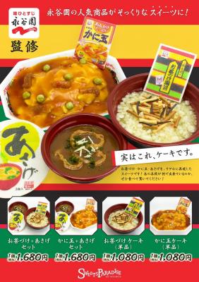 井上商事株式会社(本社:大阪市北区 代表取締約:井上敬策)は、2017年5月9日(火)から、「スイーツパラダイスケーキショップ」新宿メトロ店、ヨドバシAkiba店、通販ショップにて、株式会社永谷園(本社:東京都港区 取締役社長 :飯塚弦二郎)監修のもと、コラボレーションケーキを販売することになりました。お茶づけ、かに玉ケーキに、あさげケーキのセットも販売いたします。