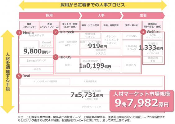 (5) Real領域:派遣・業務請負・人材紹介・クラウドソーシングなどによる人材調達サービスの領域。リアルマッチングといわれることもあることから命名。