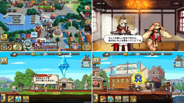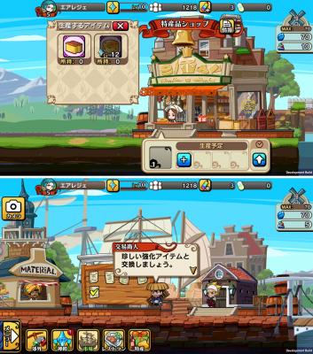 「城下町」では建築資材を集めて、さまざまな施設を建てることで街を発展させることができます。また特産品などの加工品を作ったり、施設で使える素材を集めたりすることができ、加工品や素材は交易によって、キャラクターの育成に使える強化素材と交換することが可能です。バトルでは手に入りにくい強化素材が入手できることもあります。