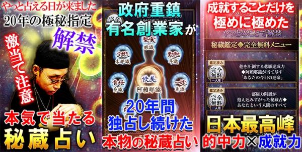 【やっと占える日が来た!】20年間の極秘指定解禁。激当たり注意の本当に当たる秘蔵占いが解禁。政府重鎮、有名政治家が独占し続けた、占い師『道龍』の本当に当たる占いをあなたの目でお確かめください。
