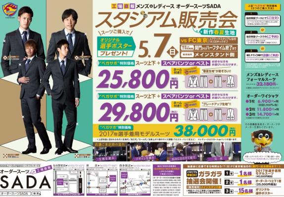 工場直販オーダースーツSADAは5/7(日)にユアテックスタジアム仙台にて「オーダースーツスタジアム販売会」を開催致します。スタジアム販売会に際しまして、2017年モデルのベガルタ仙台公式オーダースーツを発売致します。オーダースーツSADAは、スーツサプライヤーとして2017年シーズンもベガルタ仙台を応援致します。