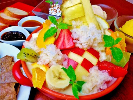 ・メニュー名 蕎麦茶ミルクの冷やしフルーツ鍋