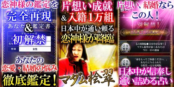 『この人本当に人間なの?』人知を超えた驚異の成就力。神懸かり鑑定に片想い男女が殺到し、予約の電話が鳴りやまない。マダム桧翠の鑑定をあなたのお手元でお楽しみ下さい。