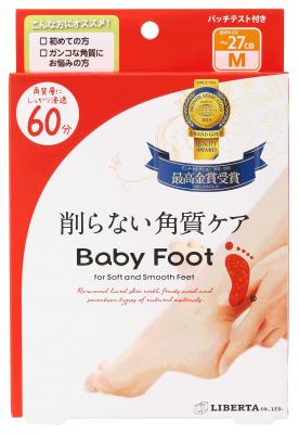ベビーフットは、足の裏に溜まった古い角質を削ることなく、履くだけで自然に落とす(※4)フットケア商品です。フルーツ酸を主成分とした専用ジェルローションの入ったフットパックに足を浸して洗い流すだけで、古くなった角質のターンオーバーを促し、約3日~10日で余分な角質を自然の摩擦で優しく落とします。