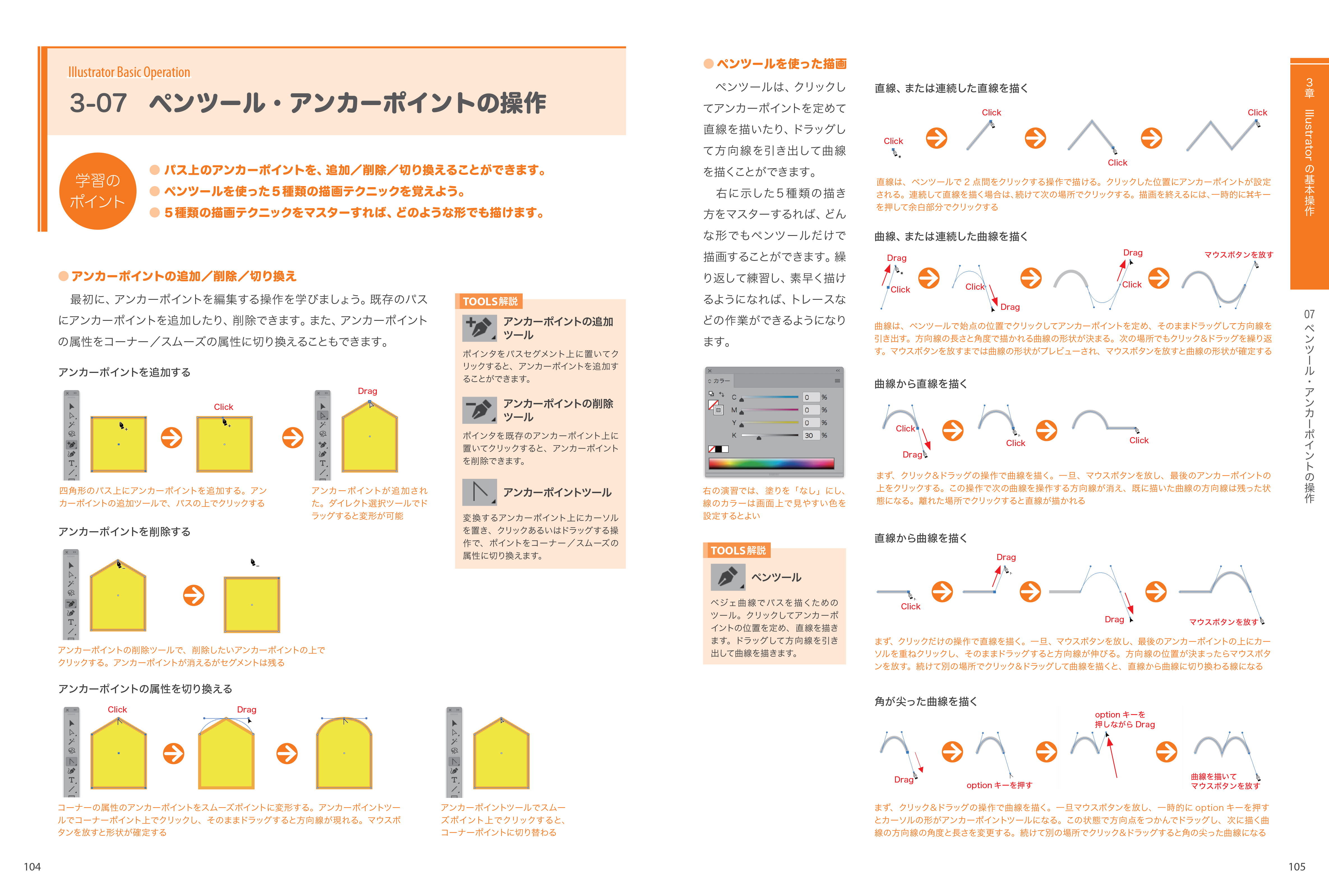 3章では、Illustratorを解説。イラスト作成やレイアウト・文字組版の操作方法を学びます。