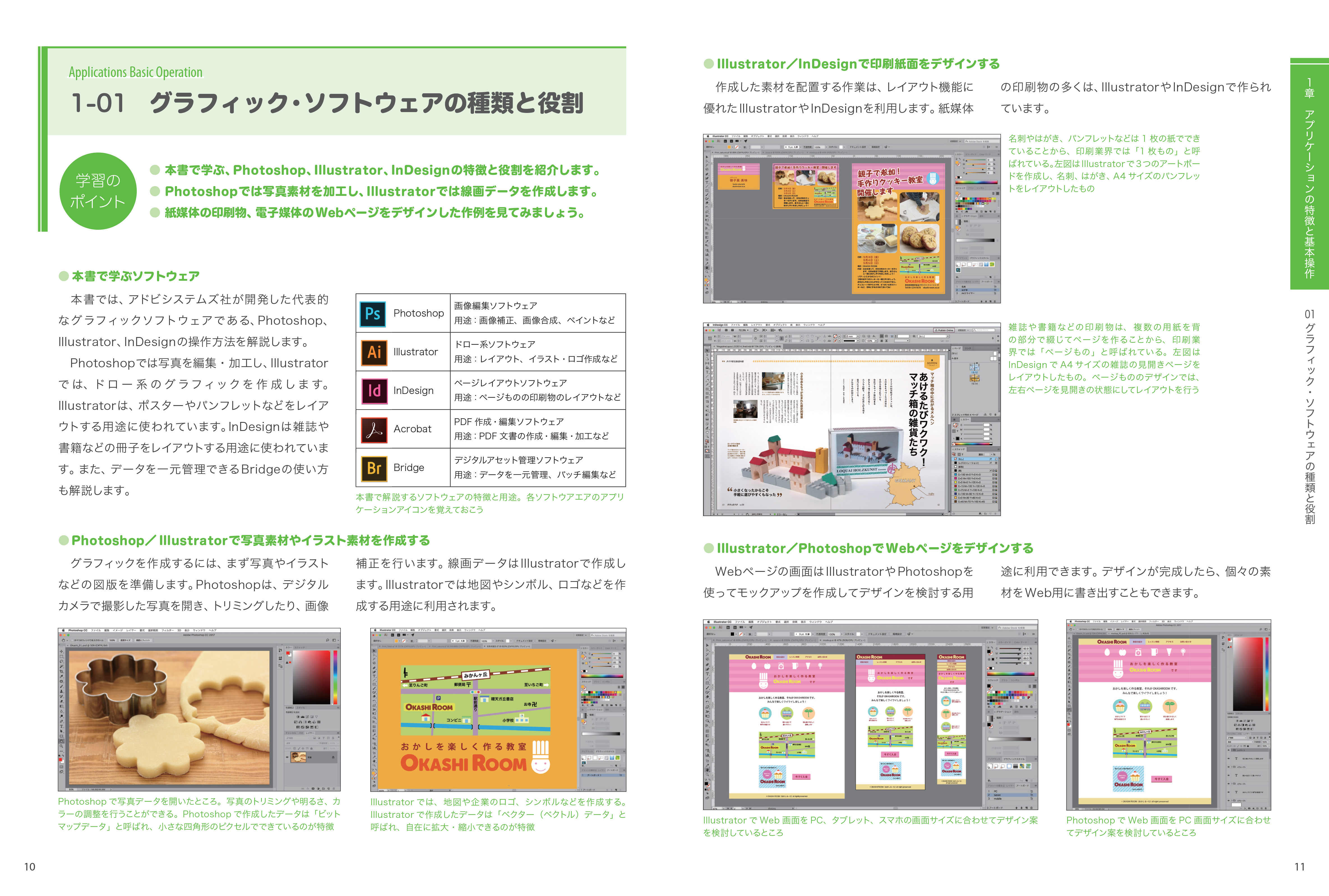 本書は、初めてAdobeのアプリケーションに触れる人を対象に、グラフィックソフトウェアの定番であるPhotoshop、Illustrator、InDesignの3大アプリを、デザイン制作を通じて基礎から学ぶ内容となっています。本書の刊行に先行して、電子版が専門学校で教科書として採用されています。