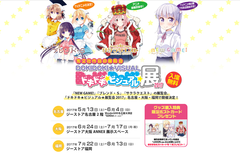 芳文社作品の可愛いキャラクター達が集まる展覧会『ドキドキ★ビジュアル★展覧会 2017』 が明日5/13(土)からジーストア名古屋2階 WonderGOO名古屋大須店“GOOst(グースタ)”より開催。大阪、福岡へと巡回致します。