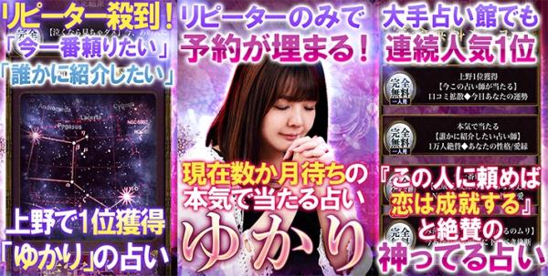 【この占い本当に当たるんです。】予約数か月待ち!大手占い館で連続1位を取り続け、個人サロンは現在数か月待ち。「この人に頼めば恋成就する」「結婚できる」と口コミが口コミを呼ぶ上野で1番人気を博す占い師「ゆかり」恋結婚ならこの人!と10000人が殺到した鑑定をあなたの目でお確かめ下さい。