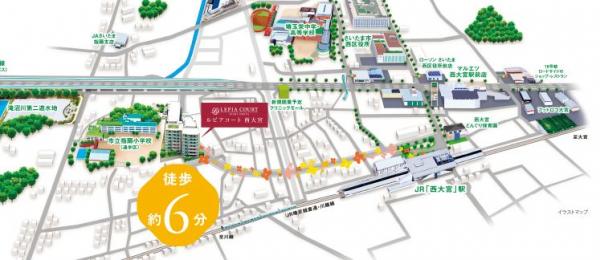 『 ルピアコート西大宮 』は、JR埼京線・川越線「西大宮」駅から徒歩6分の大宮西部特定土地区画整理事業エリア内に位置し、見通しの良い整備された駅前街区や複数の大型公園など自然環境と調和した住みやすい住環境の中に誕生します。また交通量の多い国道16号線の内側に立地し、駅から建物の間には信号がなく歩車分離で安心安全のアクセスとなっています。建設地西側には小学校が隣接している他、周辺には公園や 区役所、保育所、商業施設なども徒歩圏内にあるなど暮しやすさも優れています。
