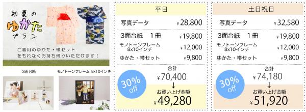 2~8才のお子様を対象に、ゆかたの着付けを当店スタッフにお任せいただき、ゆかたにピッタリの夏らしいシーンを撮影。「写真データ」「3面台紙」「モノトーンフレーム」のセットに加え、撮影時にご着用いただいた「ゆかた・帯セット」をもれなくプレゼントいたします。平日では合計70,400円(税別)が30%OFFで49,280円(税別)、土日祝日では合計74,180円(税別)が30%OFFで51,920円(税別)というお得なプライスでご提供いたします。