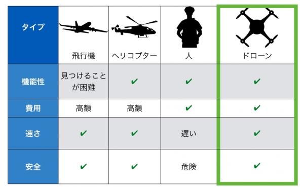 一方ドローンは上空から写真撮影が可能です。更にその写真に位置情報が付いているため違法採掘現場も容易に特定することができます。燃料も必要なく電気で飛行が可能のため、ヘリコプターなどと比較して低価格で確実に違法採掘を見つけることが可能となります。