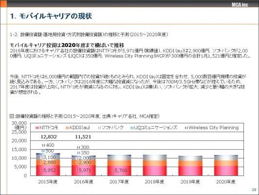 セルラーキャリアの2016年度決算が発表された。各社の設備投資額はNTTドコモが5,971億円、KDDI(au)のモバイルは3,250億円、ソフトバンクの国内通信事業が3,205億円となった。NTTドコモとKDDI(au)は2015年度に比べ、横ばいとなったが、ソフトバンクは2015年度の4,215億円から大幅な減少になり、セルラーキャリア全体の投資額にも、大きな影響を与えた。2017年度以降、投資額は微増、微減を繰り返し、いよいよ、2019年度からは5G投資がはじまる。