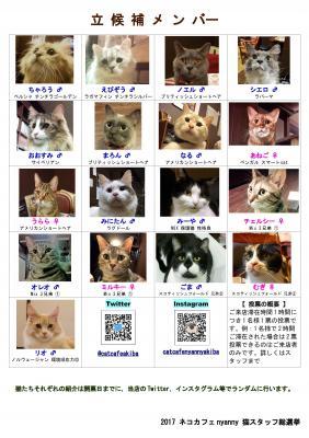 当店では,初めて行う総選挙です。それぞれの猫スタッフに熱烈なファンがおり、大幅な激戦が予想されます。ご来店滞在時間1時間につき1票ずつ投票できますので,是非ともたくさんのお客様にご投票頂きたいと思います。