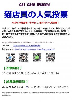 AKB48の総選挙に合わせて 秋葉原の猫カフェ「Cat cafe Nyanny(キャットカフェニャニー)丸八ホールディングス有限会社」では6月1日より猫スタッフ総勢17匹の人気投票を行います。