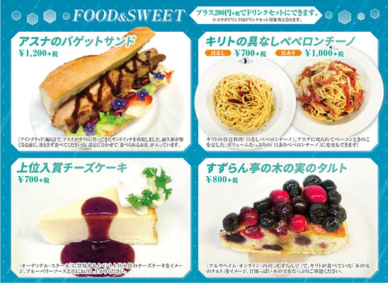 《アルヴヘイム・オンライン》「すずらん亭の木の実のタルト」、《オーディナル・スケール》「上位入賞チーズケーキ」などキリトやアスナ達も食べていたフードや、世界観をより身近に感じられるスイーツもお楽しみいただけます。