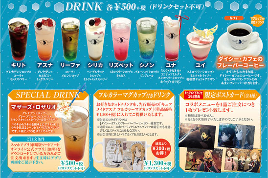 加えて、キャラクターたちをイメージしたドリンクや、『劇場版ソードアート・オンライン公式アプリ』をダウンロードしている方のみご注文いただけるスペシャルドリンク「マザーズ・ロザリオ」もラインナップ。