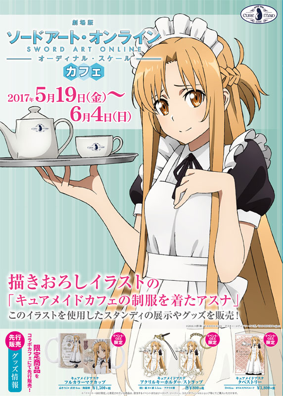 劇場版も上映中の『ソードアート・オンライン』コラボカフェが5/19(金)から、ジーストア・アキバ6F「キュアメイドカフェ」にて開催。描きおろしとなる、キュアメイドカフェの制服を着たアスナのスタンディが皆様をお迎えいたします。