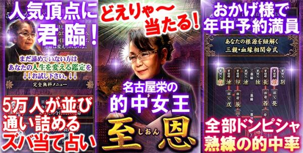 この占いどえりゃー当たる!名古屋栄の的中女王として君臨する「至恩」。そのズバ当て伝説を求めて日本各地から人だかり!おかげさまで年中満員!5万人が並び通い詰める全部ドンピシャ当ててくる熟練の鑑定をお楽しみ下さい。