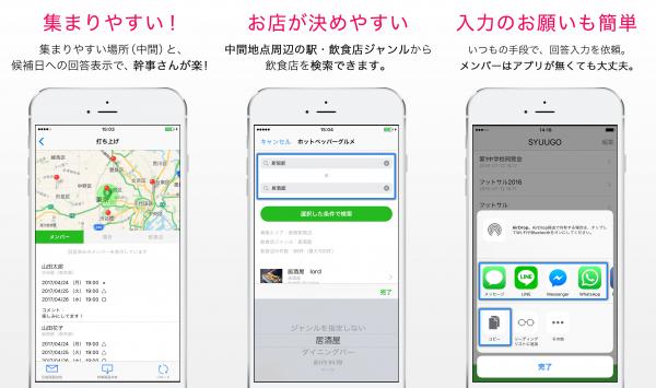 飲み会・打ち上げ・フットサルなどのイベントのさいに、幹事さんが集まる場所・お店・日程を決めやすくなるツールです。