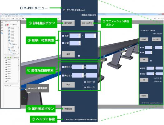 無償のPDFビューワ(=Acrobat Reader)でCIMモデルに対し、設計・施工情報、維持管理の点検記録などの属性情報の閲覧、検索に加え、属性情報の追加保存が可能です。また、平成29年3月に国土交通省より発行された「CIM導入ガイドライン(案)」および「CIM事業における成果品作成手引き(案)」の納品形式に準拠しています。