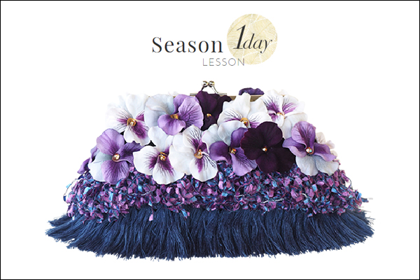 春から6月頃にかけて咲く『ビオラ』は、小ぶりで可愛らしいフォルムとカラーグラデーションの美しさから、フラワーアレンジでも多く取り扱われている人気の花です。レッスンでは、無地のポーチから、アーティフィシャルフラワー製ビオラ、ハイブランドでも使用されているMOKUBA社(※1)リボン、スワロフスキー社(※2)ラインストーンなど服飾で用いられる素材を織り交ぜて、オリジナルバッグを制作致します。カラーはファッションスタイルに合わせた3タイプを用意しております。