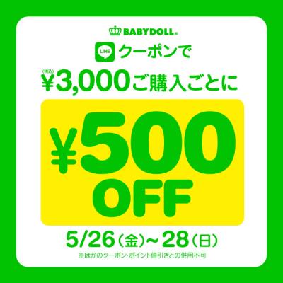 株式会社コージィコーポレーションが運営するベビー・キッズ服のBABYDOLL(ベビードール)がBABYDOLL(ベビードール)・STARVATIONS(スターベイションズ)各店、通販各店にて、5月26日(金)~28日(日)の3日間< LINEクーポン★3,000円ご購入ごとに★500円OFF >を開催します。