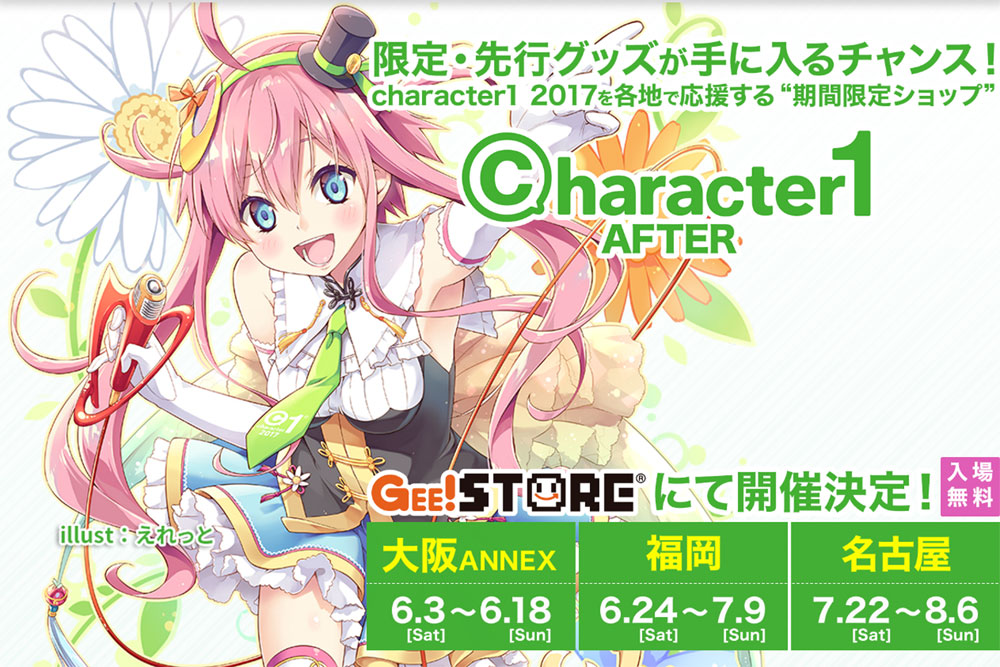 ジーストアも出展したキャラクターコンテンツ総合展示会『character1』を各地で応援する期間限定ショップ『キャラ1アフター2017』が今年も開催決定。6/3(土)より「ジーストア大阪ANNEX」を皮切りに、名古屋・福岡へ巡回してまいります。