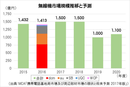 また、2016年度は無線機市場において、2015年度に引き続き、キャリア各社の参入ベンダの色分けが明確になった。国内ベンダのNTTドコモ、韓国ベンダのKDDI(au)、北欧ベンダのソフトバンクといった形である。NTTドコモとKDDI(au)は当面、この傾向に変化がみられないと推測されるが、ソフトバンクには変動の可能性がある。