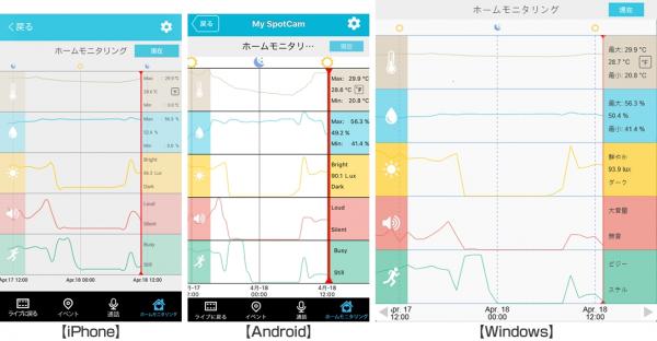 温度、湿度、照度センサーを内蔵しているので、家の映像だけでなく家の周りや中の環境を見守り、快適で安心安全な状態を保持します。