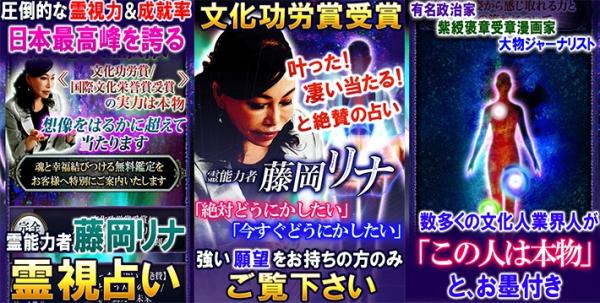 叶った!凄い当たる!と絶賛の占い師「藤岡リナ」。「絶対どうにかしたい。」「今すぐどうにかしたい。」強い願望をお持ちの方のみご覧ください。圧倒的な霊視力と成就力。日本最高峰を誇る霊能力者「藤岡リナ」の霊視占い。