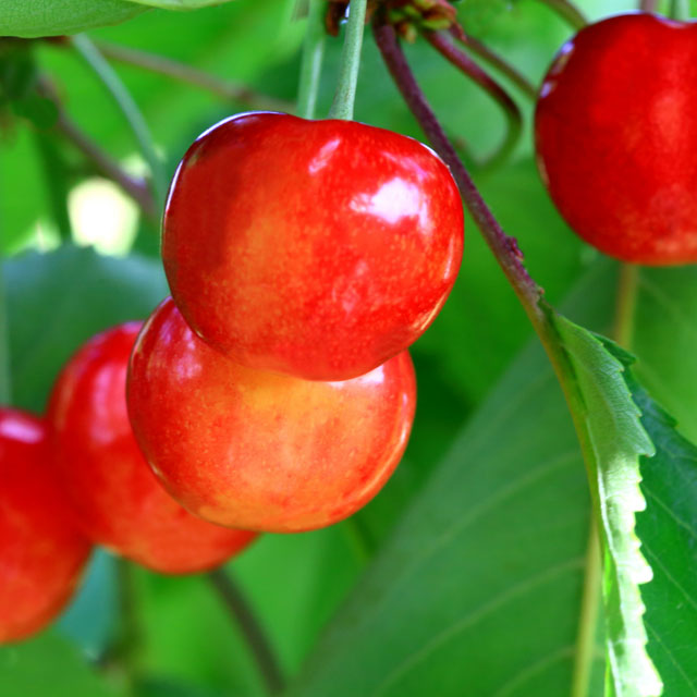 佐藤錦は、日本を代表するさくらんぼの品種です。果汁たっぷりで甘味と酸味のバランスが良く、見た目も綺麗な紅色に輝く姿から「赤いルビー」とも呼ばれています。柔らかい果肉で食べやすく、多くの人たちに愛されている、まさにさくらんぼの王様です。