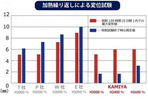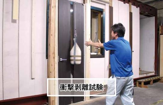 ドアを設置した状態で15kgや30kgの砂袋でそれぞれ衝撃を与え、全体の強度や接着状態を確認する衝撃剥離試験、ドアの表面に40~45度の熱を8時間照射し、最大変形量と変形残留量を確認する照射加熱による反りの試験等、過酷な試験を続け、高さがあるのに反りにくい品質へと進化させてきました。