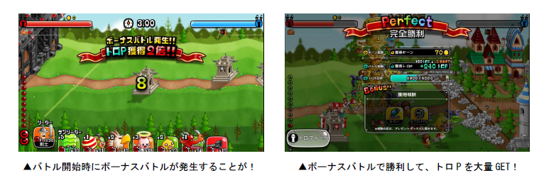 また、バトルを開始すると「ボーナスバトル」が発生することがあり、バトルの勝敗に関係なく、獲得トロPが