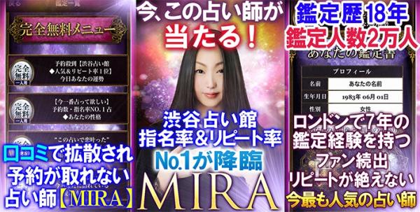 『今この占い師が当たる』渋谷占いの館、リピート率&指名率No.1占い師『MIRA』。鑑定歴18年、鑑定人数2万人。ロンドンで7年の鑑定実績をもつ、ファン続出、リピートが絶えない最も人気の占い師の鑑定がアプリでお楽しみいただけます。彼女の声を求めて人気アイドルグループの46人やモデル、女優が虜になる人気の占いをお楽しみいただけます。