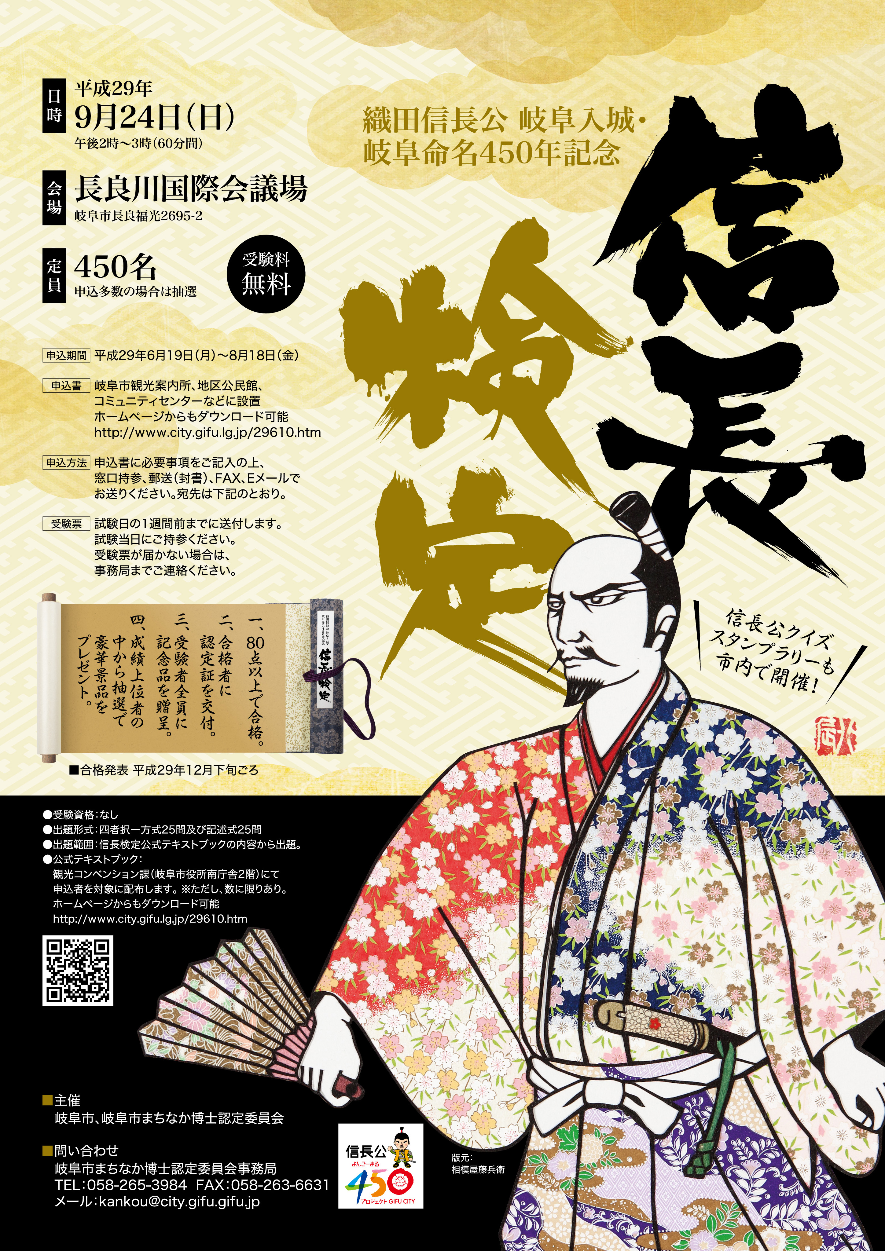 出題範囲:信長検定公式テキストブックの内容から出題。公式テキストブックは観光コンベンション課(岐阜市役所南庁舎2階)にて申込者を対象に配布します。(※ただし、数に限りがあります。)