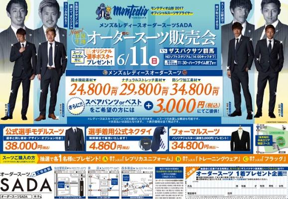 工場直販オーダースーツSADAは6/11(日)にNDソフトスタジアムにて「オーダースーツ販売会」を開催致します。スタジアム販売会に際しまして、2017年モデルのモンテディオ山形公式オーダースーツを発売致します。オーダースーツSADAは、スーツサプライヤーとして2017年シーズンもモンテディオ山形を応援致します。