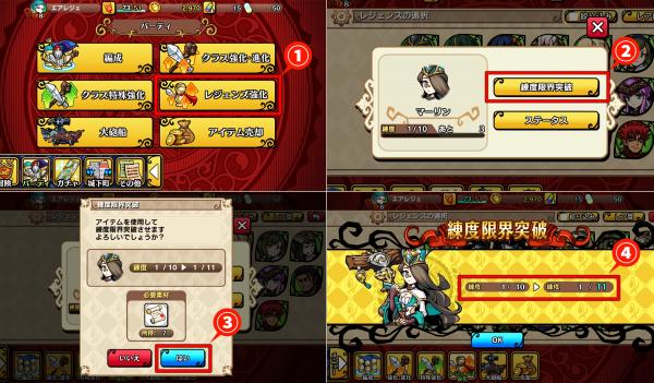※「練度」は、バトルで獲得できる修練値が一定以上たまることで上昇しキャラクターの能力値が上がります。「練度上限値」は「練度」の上限値です。