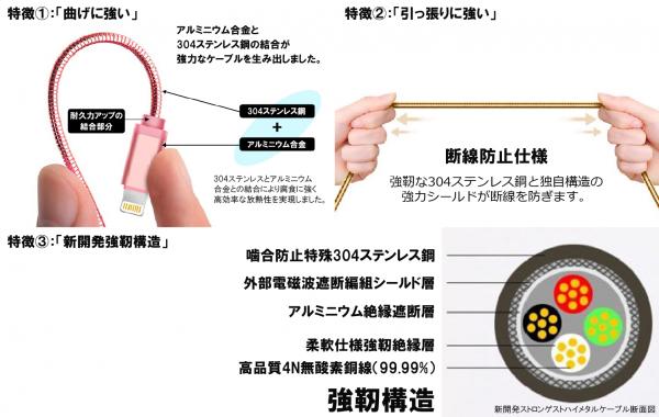 新商品「ストロンゲストハイメタルケーブル」は、特殊加工のステンレス鋼でケーブル全体を覆うことで「断線」や「巻きグセ」などといった往来のケーブルのトラブルを防止し、メタル素材独特の質感からくる美しさも兼ね備えております。