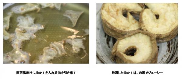 濃口醤油ベースのかえしを使用した関東風出汁とは異なり、塩分は控えめに昆布とさば節、かつお節などを合わせ、じっくりと旨味を引き出した芳醇な関西風出汁に、油かすからでる牛肉の甘み、旨味がとけ出したコク深い味わいが特徴です。
