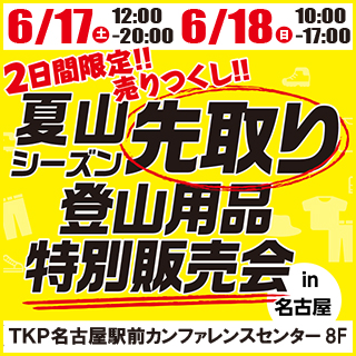 登山・アウトドア用品販売とクライミングジム運営を展開する株式会社好日山荘(本社:兵庫県神戸市)は、2017年6月17日(土)~18日(日)、TKP名古屋駅前カンファレンスセンター8F(愛知県名古屋市)にて登山・アウトドア用品の特別販売会を開催します。
