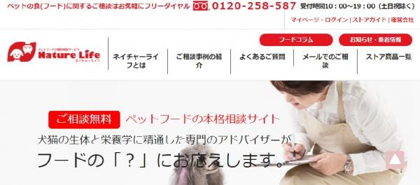 『ネイチャー ライフ』は、犬・猫の生体と栄養学に精通した専門のアドバイザーが、飼い主が抱えるペットの食事に関する不安や疑問にメールか電話で応える本格無料相談サイトです。