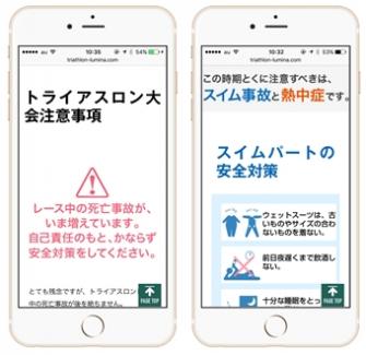 本コンテンツは、大会主催者、トライアスロンスクール、トライアスロンチームが無料で使用することができ、大会や練習会での安全意識の浸透に役立てるられます。安全対策はイラストでわかりやすく記載され、マホで閲覧できるほか大判で印刷したものを会場に掲示しても目につきやすくなっています。